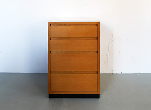 Zingg-Lamprecht in Zürich und Rothen in Bern haben in der Schweiz massgeblich zur Verbreitung der skandinavischen und vornehmlich dänischen Möbelentwürfe der 1950er und 1960er Jahre beigetragen. Die beiden Möbelgeschäfte bewarben die hochwertigen und modernen Möbel aus dem traditionellen Baustoff Holz gemeinsam in den verschiedenen Fachzeitschriften und Kulturmagazinen ihrer Zeit. Im Vordergrund standen dabei hochwertige Sitzmöbel von bekannten Entwerfern wie Hans Wegner. Daneben boten sie zur Komplettierung des Sortiments auch eigene Entwürfe an, die im Gegensatz zu den nordischen Blickfängern äusserst schlicht und zurückhaltend gestaltet waren. Dazu gehörten in erster Linie kubische Behältermöbel, d.h. vor allem Schränke und Kommoden mit einfachen Griffleisten. So auch der hier angebotene Korpus in Eiche mit weisser Kunststoffabdeckung, der beispielsweise neben einen Schreibtisch gestellt werden kann und mit seinen 70cm Höhe eine zusätzliche Ablagefläche bietet. Breite 45, Tiefe 60cm. VERKAUFT