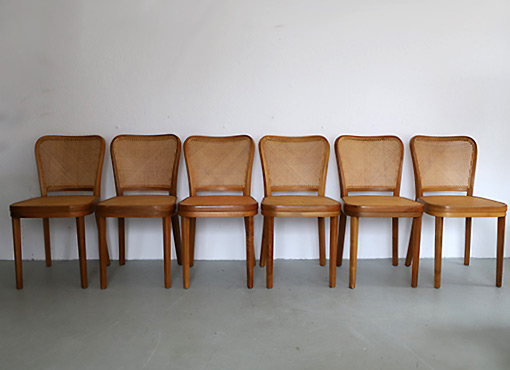 Praktisch zeitgleich mit dem sogenannten Bücherstuhl für das Interieur der Buchhandlung Girsberger schuf Max Ernst Haefeli 1926 gemeinsam mit Ernst Kadler-Vögeli, dem Entwurfsleiter bei Horgen-Glarus auch Esszimmerstühle mit Sitz und Rücken aus Jonc. Diese ersten Typenmöbel der Schweiz waren alles andere als ein Serienprodukte. Die aufwändige Joncbespannung wurde ebenso in Hand ausgeführt wie ein Grossteil der Bugholzteile. Modern war aber die Formgebung, die auf das wesentliche reduziert war und die Konstruktion offenlegte. Ein besonderer Kniff war die doppelte Zarge, die bei einer allfälligen Neubespannung des Sitzes demontiert werden konnte und so die Arbeit vereinfachte. Der im Vergleich zu den fast gleichzeitig entstandenen Stahlrohrmöbeln am Bauhaus vergleichsweise zurückhaltende Entwurf ist trotz beschränkter Produktion in Kleinserie auf den frühen Interieurs der Schweizer Moderne immer wieder zu sehen. So etwa bei den Rotach-Häusern oder Siedlung Neubühl. VERKAUFT