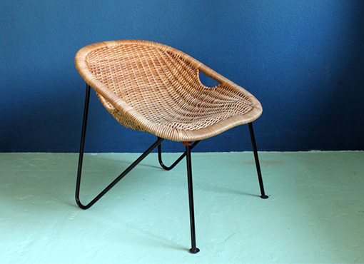 Als sich um die Mitte des zwanzigsten Jahrhunderts vergleichsweise günstige Peddigrohrmöbel neuer Popularität erfreuten, stammten die meisten Entwürfe aus Italien, wo beispielsweise Franco Albini für eine Modernisierung des Formenrepertoires sorgte. Die Produktion der Schweizer Rohrmöbelfabrikanten ist bis heute kaum aufgearbeitet, so dass die Herkunft vieler Entwürfe ungeklärt bleibt. Eine Ausnahme bildet der vom Basler Entwerfer Albert Moesch und dem Zürcher Innenarchitekten Ernst Wolfer entworfene Korbsessel, der von der Rohrmöbelfabrik Jenny in Rheinfelden hergestellt wurde. In Fachzeitschriften ist er mehrfach dokumentiert, da er 1954 und 1956 die Gute Form gewann. Der Korb ist lediglich am hinteren Rand mit Lederlaschen am Untergestell aus schwarz lackiertem Stahlrohr festgemacht und kann mit wenigen Handgriffen abgenommen werden. Das hat zum einen den Vorteil, dass bei Verwendung im Aussenbereich die Schale ohne Aufwand an einen wettergeschützten Ort gebracht werden kann. Zum andern ermöglicht es die Lagerung mehrerer Stühle auch bei beengten Platzverhältnissen. VERKAUFT