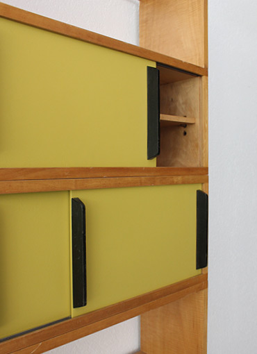1945 präsentierte Alfred Roth in der SWB-Zeitschrift Werk eine „Notzimmer-Garnitur“, die von Mauritius Ehrlich entworfen worden war und von der von ihm mitbegründeten Firma Aermo in Zürich hergestellt wurde. Ehrlich schaffte es, eine gesamte Ausstattung mit Schrank, Tisch, Hockern und Pfannen zwischen zwei zu einer Kiste zusammengeschnürten Bettrahmen zu verstauen, die dann an Kriegsgeschädigte geliefert werden konnte. Während des Wiederaufschwungs der fünfziger Jahre wurden dann die aus der Not heraus angewandten Prinzipien der Normierung, Multifunktionalität und Schlichtheit auf Möbel für den „normalen“ Gebrauch übertragen. So entstand auch das hier angebotene Regalsystem, das aus verschiedenen Elementen einfach und ohne Schrauben zusammengesetzt werden konnte, indem die jeweils hälftig mit Boden und Deckel ausgestatteten Teile aufeinander gestapelt wurden. Das hier angebotene Regal besteht aus fünf Elementen – drei davon mit Schiebetüren, die im originalen Farbton neu lackiert wurden. 165x80x23.5cm. VERKAUFT