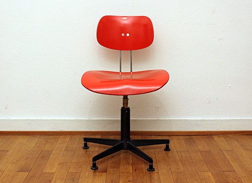 Egon Eiermann gehört nicht nur zu den einflussreichsten Architekten Deutschlands der Nachkriegszeit, sondern spielte auch im Möbeldesign eine wichtige Rolle bei der „Wiedereinführung“ moderner Formen nach der Zäsur durch das Dritte Reich. Bereits in den vierziger Jahren begann er mit der Entwicklung moderner Serienmöbel, die zum Teil in den Entwürfen von Charles und Ray Eames ihr Vorbild fanden. Dazu gehört auch der 1950 entworfene Allzweckstuhl, der aus einem Stahlrohrgestell und Sitz- und Rückenflächen aus anatomisch angepasstem Sperrholz bestand. Neben einfachen stapelbaren und nicht stapelbaren Versionen gehörte auch ein Bürostuhl zur Serie. Der hier angebotene Stuhl stammt aus den 1970er Jahren. Sitz und Rücken aus signalrot lackiertem Buchenholz. Untergestell dunkelgrau lackiert. Sitz höhenverstellbar, Rücken in der Höhe und Tiefe justierbar. VERKAUFT