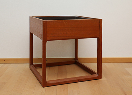 Mit dem Einzug lebendiger Pflanzen in den Wohnraum erscheinen auch die ersten Pflanzenständer. In der Nachkriegszeit erleben die Zimmerpflanzen einen regelrechten Boom. Die – am liebsten gezähmte exotische – Natur wird zum Schmuck der guten Stube und geht Hand in Hand mit den vegetabilen Ornamenten auf Tapete und Vorhang. Dass die dänischen Hersteller auf Pflanzenständer in Teakholz setzten, versteht sich von selbst. Das hier angebotene Modell eignet sich für Sukkulenten oder Kakteen. Die Stollenkonstruktion aus massivem Teakholz trägt eine wasserdichte Kunststoffschale. Zugeschrieben wird der kubische Entwurf in der Regel Aksel Kjersgaard, der auf die Produktion von Kleinmöbeln spezialisiert war. 45 x 45cm x 45cm. VERKAUFT
