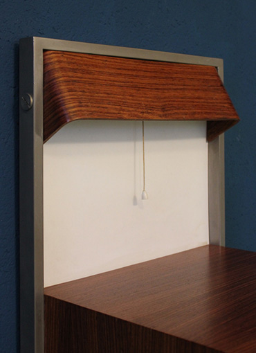 Die aus der ersten Hälfte der sechziger Jahre stammenden Nachttischen zeichnen sich durch ihre ungewöhnliche Konstruktion aus: In den vernickelten Vierkantstahlrahmen wird der aus gebogenem Sperrholz bestehende Lampenschirm, das Schubladenelement und die weisse, das Licht reflektierende Rückwand eingespannt. Der Rahmen selber wird dann mittels zweier Schrauben auf beliebiger Höhe an der Wand befestigt. Hersteller war die in Padua ansässige Firma 3V Mobili. Für sie entwarf Georges Coslin in den sechziger Jahren verschiedene Aufbewahrungsmöbel – darunter wohl auch die hier angebotenen Nachttischen in Palisander. 49 x 40cm, 35cm Tiefe. VERKAUFT