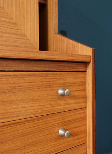 Das hier angebotene Möbel aus Palisanderholz wurde in Padua vom Hersteller 3V in den sechziger Jahren hergestellt. Hinter der Schiebetür im oberen Teil des Möbels verbirgt sich ein mobiler Spiegel (der bei Nichtbedarf bequem ausgebaut werden kann). Die Ablagefläche kann nach vorne ausgezogen werden, um eine eigentliche Tischfläche zu erhalten. Darunter bieten vier grosszügige Schubladen mit vernickelten Knäufen Stauraum. Als Entwerfer kommt Georges Coslin in Frage, der für verschiedene italienische Hersteller gearbeitet hat und auch für 3V Mobili in Padua Entwürfe beigesteuert hat. VERKAUFT