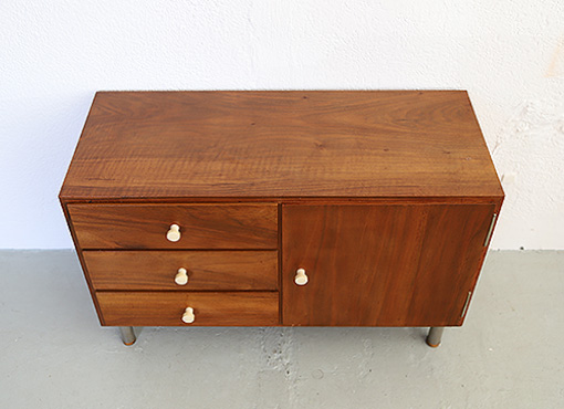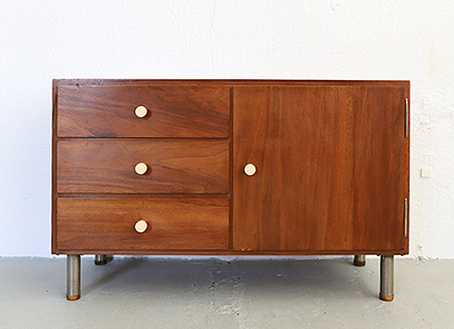 Nur wenige kleine Kommoden bzw. Nachttische aus dem 3M-Programm von Otto Meier und Ernst Mumenthaler sind bis heute überliefert, lag der Fokus doch auf den Schränken und höheren Kommoden, mit denen die beiden 1927 den Wettbewerb für zeitgemässes Arbeitermobiliar gewannen. Offenbar vom anfänglichen Erfolg beflügelt, erweiterten Meier und Mumenthaler ihre Sortiment an Behältermöbeln und führten quasi als halbe Kommode (die ihrerseits einem halben Schrank entsprach) das Nachttischen ein, das in der Regel mit Schubladen und einer Schwingtüre ausgestattet war. Das hier angebotene Nachttischchen stammt aus einer umfassenden Einrichtung mit 3M-Möbeln, die um 1940 in Nussbaum hergestellt wurde. 84 x 54cm x 35cm. VERKAUFT