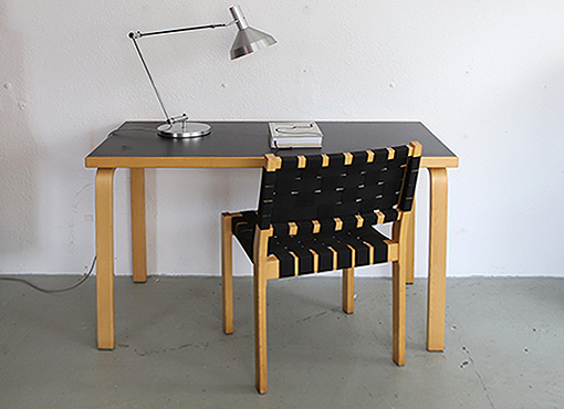 Auf der Basis seines 1933 patentierten L-förmigen Fusses aus Birkenholz entwarfen Alvar und Aino Aalto Mitte der 1930er Jahre verschiedene Tische und Stühle, die grösstenteils in der ebenfalls 1935 fertiggestellten Bibliothek in Viipuri – einem Schlüsselbau der Aaltos – Verwendung fanden. Dank der Bekanntschaft mit dem strammen Schweizer Verfechter der Moderne Sigfried Giedion kamen die Aalto-Möbel schon früh in die Schweiz, wo sie bis heute durch Wohnbedarf verkauft werden. Gerade in den 1960er bis 1980er Jahren erfreuten sich die schlichten und doch einprägsamen Entwürfe grosser Beliebtheit unter Architekt:innen. Der hier angebotene kleine Tisch stammt vermutlich aus den 1990er Jahren, weist aber noch den Linoleum mit leicht unregelmässiger, glänzender Oberflächenstruktur auf, die dem heutigen Möbellinoleum fehlt. 120 x 60cm. Höhe 71.5cm. VERKAUFT