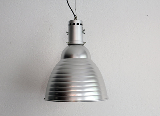 In den 1940er Jahren beginnt Bemag – später Alumag – mit der Produktion von Strahlern, die ganz aus Aluminium gefertigt sind und mit ihrem mehrfach gerillten Reflektor vor allem in Werkstätten und Ateliers eingesetzt werden. Nachdem die in verschiedenen Varianten hergestellten Leuchten fast ganz vom Markt verschwinden und durch modernere Leuchtmittel verdrängt werden, werden sie in den 1980er Jahren wiederentdeckt – nun aber zur Beleuchtung von Wohnräumen. Beat Kaufmann gründet eigens die Firma Licht + Raum und beginnt die Leuchten wieder zu produzieren und das Sortiment zu ergänzen. Die beiden grossen Deckenleuchten verfügen über je zwei Leuchtmittel mit handelsüblichen G24-Fassungen (auch als LED erhältlich. Die Position der Leuchtmittel und damit die Lichtkegelgrösse lassen sich über Flügelmuttern justieren. Durchmesser 41.5cm. VERKAUFT