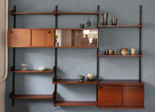 Es wäre nicht ganz abwegig, wenn man die fünfziger Jahre in Sachen Möbel als Jahrzehnt des Regals bezeichnen würde. In keiner andern Zeit wurden derart viele Regalsysteme entwickelt. Um 1960 kamen Varianten mit Schienen hinzu: Dabei wurden schmale Metallschienen mit der Wand verschraubt, in die dann die mit Haken versehenen Regalböden und andere Elemente eingehängt werden konnten.