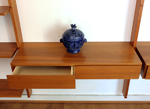 Das hier angebotene Regal ist in hellem Nussbaum ausgeführt: Die Seitenwände sind zwei Meter lang, die Tablarspannweite beträgt ein Meter (die Tiefe 20cm). Das Regal umfasst 4 Seitenwände, 10 Regale und zwei Schubladenkorpusse mit jeweils Schubladen. VERKAUFT