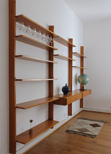In den sechziger Jahren gehörte Möbel Rösch in Basel zu den fortschrittlichen zu Geschäften, die mit modernen Möbeln handelten. Das Sortiment umfasste neben der Herman Miller Collection und den Designs von Verner Panton auch ein Anzahl eigener Entwicklungen, die zum grössten Teil aus der Hand von Urs Rösch stammten und in der firmeneigenen Schreinerei im basellandschaftlichen Reinach gefertigt wurden. Zu den erfolgreichsten Entwürfen aus dem Eigensortiment gehörte das sogenannte Röba-Wandmöbel, das 1960 vom Schweizer Werkbund mit der Guten Form prämiert wurde. Die schmalen Seitenwände werden mittels dreier Schrauben in der Wand fixiert und können so auch ohne Weiteres in Altbauwohnungen über der Sockelliste platziert werden. Die Tablarfixierung erfolgt dank einer ebenso simplen wie patenten Lösung durch vier Messingdübel, in die das Tablar erst hinten eingefahren und dann nach unten gekippt wird.