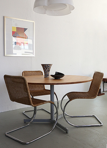Das elegante Untergestell in grau lackiertem Stahl verfügt über höhenverstellbare Füsschen. Die Tischplatte wurde erneuert und ist aus Massivholz gefertigt. Durchmesser 125cm für bis zu 6 Personen. VERKAUFT