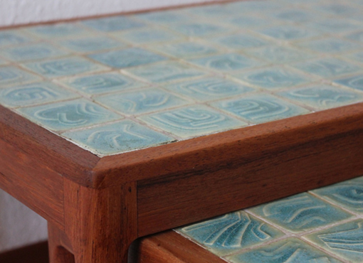 Die beiden Satztische sind aus massivem Teakholz gefertigt. Die auf einer filigranen Unterkonstruktion liegende Tischoberfläche ist in celadonfarbenen Fliesen mit Reliefoberfläche ausgeführt. Gekauft wurden die Tische Anfang der sechziger Jahre für die skandinavische Einrichtung eines Ferienhauses. BxTxH: 47 x 31.5 x 47cm; 53.5 x 33 x 51.5cm. VERKAUFT
