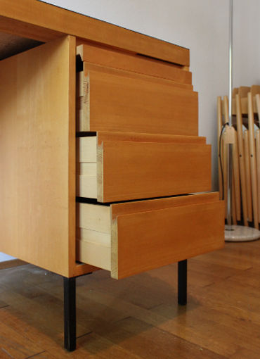 Nachdem Dieter Waeckerlin in der zweiten Hälfte der fünfziger Jahre das Basler Möbelgeschäft Idealheim von seiner Mutter übernommen hatte, wurden die von ihm entworfenen DW-Massmöbel in vier verschiedenen Hölzern angeboten: Teak, Nussbaum, Palisander und Birke, wobei letztere nur bis Anfang der sechziger Jahre angeboten, da die Nachfrage nach hellen Hölzern zugunsten von dunklen Tropenhölzern in dieser Zeit stark zurückgegangen war. Der hier angebotene kleine Schreibtisch in Birke mit neu belegtem Tischblatt aus Linoleum ist allerdings nicht bloss aufgrund des verwendeten Holzes selten, sondern auch wegen seiner Ausführung. Der Entwurf folgt zwar dem Tisch der Serie I, allerdings kommt hier ein fest verschraubter Schubladenkorpus zum Einsatz und nicht wie üblich ein Korpus auf Rollen mit aufklappbarer Ablagefläche. Später konnte dieses Modell durch den vielseitigeren Tisch der Serie II ersetzt werden, was die verkauften Stückzahlen zusätzlich niedrig hielt. Tischformat 113 x 70cm. VERKAUFT