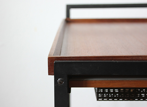 Der schlichte Servierwagen mit längsrechteckigem Flachstahlrahmen und Ablagen aus Teakholz stammt mit grosser Wahrscheinlichkeit aus Schweizer Produktion. Die obere Ablage ist nicht fest mit dem Untergestell verbunden und lässt sich als Tablar verwenden. Ebenfalls in der oberen Etage verbirgt sich eine zweite, beidseitig ausziehbare Abstellfläche mit integriertem Rechaud und einer Oberfläche aus strapazierfähigem Kellco. VERKAUFT