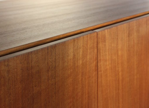 1956 entstanden die Entwürfe zu einer neuen Anrichte, die international für Aufsehen sorgte. Entgegen den verbreiteten amorphen Formen der fünfziger Jahre, entwarf Waeckerlin einen monolithischen Block, der auf einem filigranen Metallgestell ruhte und die klaren, orthogonal verlaufenden Linien der sechziger Jahre vorwegnahm. In der firmeneigenen Schreinerei gelang die Verarbeitung der Holzfurniere so präzise, dass die einzelnen Schwingtüren bereits aus nächster Distanz nicht mehr wahrgenommen werden konnten. Anstelle von Griffen ermöglichte ein rundumlaufender Abstand zwischen Kasten und Türen das Öffnen. Die Inneneinteilung erfolgte nach Kundenwunsch. Ein cleveres Raster ermöglichte es dabei, eine beschränkte Anzahl von Zügen, Tablaren und Schubladen fast beliebig zu kombinieren. Das Tiefenmass war dabei so festgelegt, dass zwei Tellerstapel gut hintereinander Platz fanden. In grösserer Stückzahl wurden die Anrichten von Behr in Deutschland gefertigt. Die Verarbeitungsqualität der viel kleineren Produktion durch das Idealheim in Basel wurde dabei allerdings nicht erreicht – zudem kam es zu Änderungen bei den Massen, die Waeckerlin ursprünglich vom Modulor Le Corbusiers abgeleitet hatte. Das hier angebotene Sideboard ist 226cm lang und in Nussbaum furniert, hergestellt wurde es in den 1960er Jahren durch die Idealheim AG. VERKAUFT