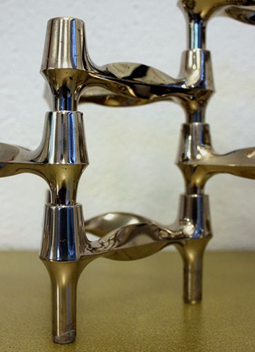 Was im Möbelbau bereits in den fünfziger Jahren seinen Lauf nahm und in den sechziger Jahren grosse Popularität erreichte, nämlich modulare Möbelsysteme wie das M125 von H. Gugelot oder das USM Haller Regal, scheint die Ende des Jahrzehnts auch die Gestalter von Objekten für den Tischbedarf inspiriert zu haben. Allen voran die Hersteller der sogenannten Kombileuchter: So etwa die Besteck- und Metallwarenfabrik, kurz BMF, die in Solingen gegründet wurde und Mitte des zwanzigsten Jahrhunderts nach Bayern zog. Die symmetrische Dreieckskonstruktion ermöglicht ein Lego-ähnliches Zusammenstecken, das architektonische Gebilde zulässt, die durchaus Ähnlichkeiten zur Architektur jener Jahre hat. VERKAUFT