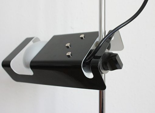 Die mit 140cm Höhe eher kleine Stehleuchte hat einen höhenvestellbaren schwarz, weiss emaillierten Reflektor, der unterschiedlich geneigt werden kann. Die Leuchte ist mit einer B22-Bajonettfassung ausgestattet. Das Spezialleuchtmittel ist bis heute erhältlich. VERKAUFT