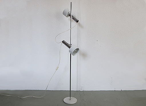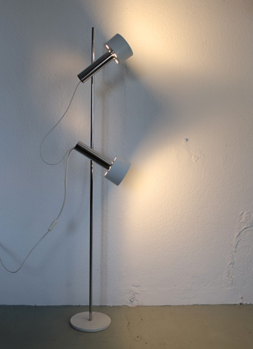 Edi Franz hatte Mitte der 50er Jahre diesen einfachen Lampentyp entworfen und in der Schweiz populär gemacht. In den folgenden Jahren stellten diverse Schweizer Hersteller Stehlampen mit Reflektoren her, die auf die damals neuartigen Spotglühbirnen abgestimmt waren und einen gezielten Lichteinsatz ermöglichten. Anders als bei den Lampen von Franz werden die Spots hier nicht mittels einer Schraube an der Stange fixiert, sondern durch einen einfachen Ring, der Dank des Eigengewichtes mit der Stange verkantet und so eine unkompliziertere Höhenverstellung garantiert. Die Lampenfassungen können in den verchromten Rohren so hin- und hergeschoben werden, dass verschiedene Glühbirnengrössen mit E27-Gewinde verwendet werden können. VERKAUFT