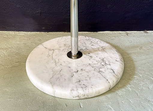 Der italienische Entwerfer Bruno Gecchelin wendete sich ab den späten sechziger Jahren dem Leuchtendesign zu, nachdem er davor unter anderem bei Olivetti unter Ettore Sottsass als Produktedesigner gearbeitet hatte. Besonders intensiv setzte er sich mit den um 1970 eingeführten Hochvolt-Halogenleuchtmitteln auseinander, die aufgrund ihrer Lichtstärke besonders gut zur indirekten Beleuchtung eingesetzt werden konnten. Unter den zahlreichen Entwürfen für verschiedene italienische Lampenhersteller gehört die hier angebotene Mezzaluna, die Gecchelin 1973 für Skipper entwarf, zu seinen bekanntesten: Der halbkreisförmiger Reflektor aus weiss gespritztem Metall kann hundertachtzig Grad um die eigene Achse gedreht werden und damit sowohl der direkten als auch der indirekten Beleuchtung dienen. Um die Lichtstärke dem jeweiligen Bedarf anzupassen, kann sie durch einen direkt am Schirm angebrachten Regler gedimmt werden. Der Lampenschaft besteht aus einem höhenverstellbaren Teleskoprohr, das ohne zusätzliche Schrauben oder Bolzen verstellt werden kann. Das ganze ruht auf einem weissen Marmorfuss, der der Lampe einen guten Stand gibt und dessen halbrundes Profil quasi das Gegenstück zum gekehlten Metallreflektor bildet. VERKAUFT