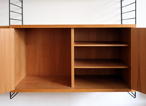 1949 schreibt ein schwedischer Buchverlag einen Wettbewerb für Bücherregale aus: Nisse und Kajsa Strinning reichen einen Entwurf mit feingliedrigen Metallleitern und einfachen verstellbaren Regalböden ein und gewinnen den ersten Preis. Dem Entwurf vorangegangen waren Nisse Strinnings Versuche, Metalldraht mit buntem Kunststoff zu überziehen, um daraus ein Abtropfgitter für Geschirr zu fertigen. Dasselbe Prinzip verwendete er dann auch für die Leitern des modularen Büchergestells, mit dem bereits 1950 das UN-Hauptgebäude in New York ausgerüstet wurde. In den folgenden Jahren wurde das String-Regal um zahlreiche Elemente wie Schubladen, Schiebetüreschränke und vieles anderes mehr erweitert. Gleichzeitig eroberte die günstige Alternative zum massgefertigten Regal den europäischen Markt. Unter anderem wurden in Deutschland und der Schweiz Niederlassungen gegründet. Ausgezeichnet mit der Goldmedaille an der Triennale in Mailand 1954 avancierte das Regal in den fünfziger und sechziger Jahren zum Designklassiker. Ausführung in Ulme und schwarzen Leitern. Ca. 160 x 160cm. VERKAUFT