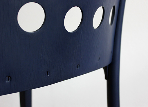 Hoffmann ist in Sachen Architektur und Design eine der prägendsten Figuren Österreichs in der ersten Hälfte des 20. Jahrhunderts. Mit dem Palais Stoclet schuf er das vermutlich wichtigste Bauwerk im Stil der Wiener Secession. Die typische geometrische Ornamentik prägte aber nicht nur Hoffmanns Architektur dieser Zeit. Als Begründer der Wiener Werkstätte übertrug er die einfache Formsprache mit Quadrat, Dreieck und Kreis auch auf Möbel und andere Objekte. Im Verlauf der Jahre werden seine Entwürfe zusehends schlichter, ohne sich aber ganz der funktionalistisch geprägten Moderne unterzuordnen. Das gilt auch für das hier angebotene Modell 811, das er in verschiedenen Varianten für Thonet um 1930 entwarf. Nebst Ausführungen in Jonc gelang ihm vor allem mit der Version mit gelochtem Sperholzrücken ein besonders einprägsamer Entwurf. Wie für die Serie typisch wurden die Vorderbeine mit quadratischem Grundriss und die Hinterbeine mit rundem Profil ausgeführt. Die Beine wurde zudem mit aufwändig geformten Metallgusswinkeln stabilisiert, so dass eine relativ dünne Sitzzarge verwendet werden konnte. Die hier angebotenen Stühle wurden vermutlich nachträglich sorgfältig in Nachtblau gestrichen. VERKAUFT