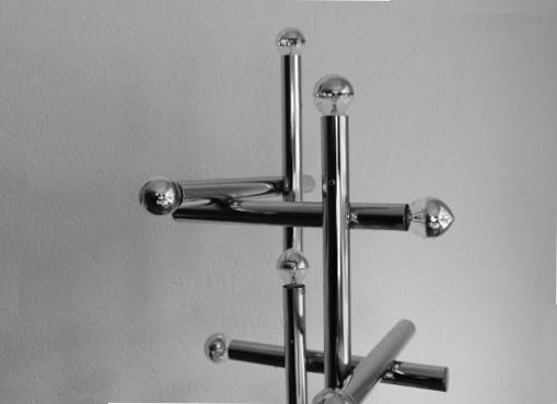 Das hier angebotene Modell stammt aus eben dieser Zeit, als Temde verschiedene mehrflammige Tisch- und Deckenlampen im Angebot hatte. Neun verchromte Metallzylinder sind in rechten Winkeln miteinander verbunden und deuten so eine Gitternetzstruktur an, die einseitig durch eine Glühbirne abgeschlossen wird. Die Tischlampe kann mit allen handelsüblichen Leuchtmitteln ausgestattet werden. Höhe 85cm. VERKAUFT