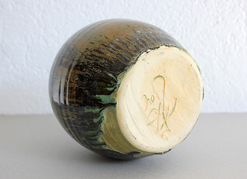 Die signierte, wohl 1970 entstandene Vase besticht durch ihre vielfarbige Laufglasur: Die Farben reichen von verschiedenen Grüntönen bis zu Braun- und Ockertönen. Die flaschenförmige, dickwandige Studiokeramik verfügt dank ihres Gewichts über einen guten Stand und eignet sich zur Aufnahme von Zweigen und kleine Ästen. Höhe 23cm. VERKAUFT