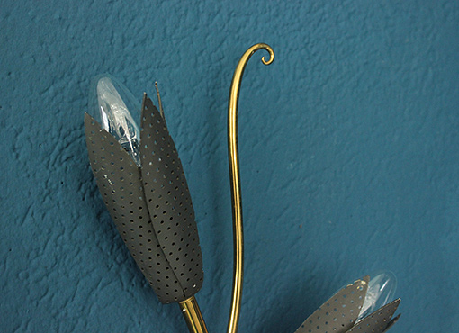 Die aus Dänemark stammenden Wandlampen vereinigen die typischen Merkmale der fünfziger Jahre: Lochblech, Messing und florale Formgebung. Die Montage erfolgt über zwei Messingschrauben. Die Lampen sind mit dreipoligem Textilkabel ausgestattet, könnten aber – falls vorhanden – auch direkt an einen Wandanschluss montiert werden. Je drei E14-Fassungen für Kerzenglühbirnen. VERKAUFT