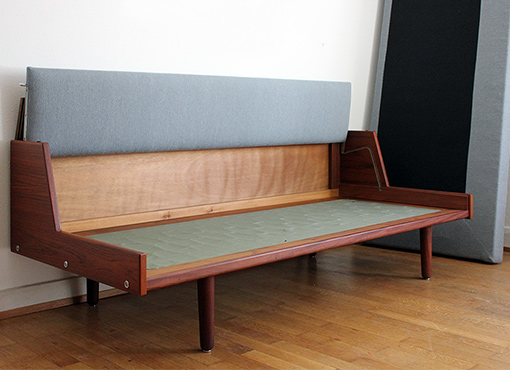 Während seiner langen Karriere als Möbelentwerfer schuf der ursprünglich als Möbeltischler ausgebildete Hans J. Wegner über hundert Stuhl- und Sesselentwürfe. Damit gehört Wegner zu den wichtigsten Vertretern des dänischen Designs, das vor allem ab Mitte des 20. Jahrhunderts grosse internationale Anerkennung fand. Er prägte das Bild einer modernen Gestaltung, die sich nicht gegen das bereits Vorhandene stellt, sondern meist traditionelle Entwürfe und Herstellungsformen als Ausgangspunkt wählt. Wegners Bandbreite reicht dabei von äusserst aufwändigen Stücken bis zu einfacheren Möbeln, die für eine breite Käuferschicht erschwinglich waren. Solche Serienmöbel schuf Wegner etwa für den Hersteller Getama, der mit dem Modell GE258 1954 ein Bettsofa im Sortiment hatte, das beispielsweise in kleinen Wohnungen als Sofa und Gästebett gleichzeitig dienen konnte. Hinter der Rückenlehne verbirgt sich ein Stauraum für Decke und Kissen. Wird die Rückenlehne nach oben gehoben, klappt gleichzeitig der Deckel nach hinten. So erhält man Zugang zum Stauraum und die Liegefläche wird ganz frei gegeben. Das hier angebotene Modell in Teakholz stammt aus der ersten Serie mit konisch verlaufenden Beinen, Sperrholzrückwand und Führungsschienen aus Aluminium. Spätere Varianten des erfolgreichen Möbels besassen rechteckige Beine, eine Pavatexrückwand und einen simplere Umsetzung des Klappmechanismus. Neu aufgepolsterte Federkernmatratze mit blaugrauem dänischem Wollstoff von Hanne Vedel frisch bezogen. VERKAUFT