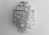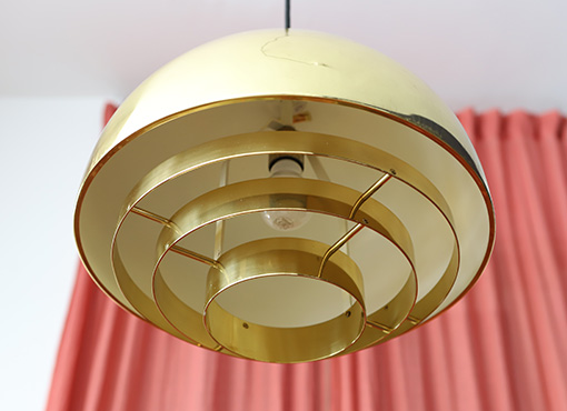 Wie so viele Möbelfirmen aus dem Luxussegment taten sich die Vereinigten Werkstätten nach dem Krieg schwer, da der Absatzmarkt weggebrochen war und auch stilistisch neue Zeiten herrschten. Zumindest bei den Leuchten konnte die Firma ab den 1960er Jahren noch einmal punkten und zwar mit Entwürfen, die sich an skandinavischen Vorbildern orientierten, diese aber teilweise qualitativ übertrafen. Zu diesen gehört auch die hier angebotene halbkugelförmige Leuchte (Modell 17’695) aus massivem Messingblech mit konzentrisch angeordneten, einzeln verschraubten Reflektoren. Durchmesser 40cm. CHF 900.–
