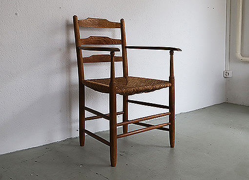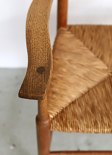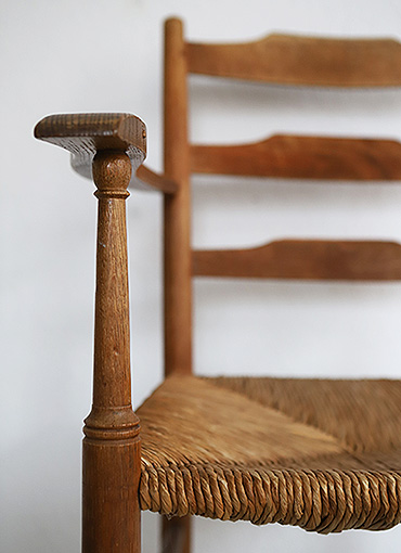 Der Clissett-Stuhl geht auf den gleichnamigen englischen Stuhlmacher Philip Clissett zurück, der diese Stühle im 19. Jahrhundert und Anfang des 20. Jahrhunderts mit einfachsten Mitteln hergestellt hat. Wie damals üblichliessen sich die in ihrer Konstruktion zum Teil sehr ähnlichen Stühle dank der variierenden Formen der Details identifizieren – in diesem Fall sind es beispielsweise die kegelförmigen Enden der Rückenlehne, die mittig erhöhten Latten des Rückens sowie die Gestaltung der Vorderbeine und die S-förmig geschwungenen Armlehnen. Clissett, der noch bis zu seinem Tod 1913 Stühle fertigte, ist für die englische Möbelgeschichte deshalb zu einer wichtigen Figur geworden, weil er grossen Einfluss auf die Arts & Craft Bewegung im letzten Viertel des 19. Jahrhunderts hatte. Verschiedene Vertreter dieser für die Moderne so wichtigen Bewegung, die einen Zusammenschluss von Kunst und Handwerk forderte, waren mit Clissett in Kontakt. Darunter etwa Ernest Gimson, der das Handwerk bei Clissett erlernte. Aber auch der Architekt James MacLaren, der der Legende nach bei einem seiner Spaziergänge zufällig auf Clissett stiess und dafür sorgte, dass die berühmte Londoner Art Workers Gild – der alle prominenten Arts & Craft Vertreter angehörten – 1884 mit Clissett-Stühlen ausgestattet wurde. Sie verrichten dort bis heute dort ihren Dienst. Ein ebensolcher Stuhl mit niedriger Lehne, wie sie für die Bestuhlung des grossen Saals verwendet wurden, wird nun hier angeboten. Rahmen in massiver Eiche, Sitz aus Schilfgeflecht. Vermutlich erste Hälfte des 20. Jahrhunderts hergestellt. CHF 450.–