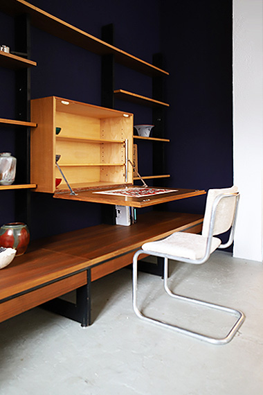 In den 1950er Jahren konstatierte der bekannte Verfechter der Moderne und Architekturhistoriker Sigfried Giedion die Wiederbelebung der Wand. Während in der frühen Moderne die Wände innen wie aussen möglichst unangetastet blieben, änderte sich das nach dem Krieg. Für die Innenräume bedeutete das die Auflösung der klaren Unterscheidung zwischen Möbel und Architektur. Insbesondere Staumöbel wurden nun als Bestandteil der Zimmerbegrenzung oder sogar als Trennelement und quasi als fünfte Wand aufgefasst. Um die Forderungen der Moderne nach Flexibilität und ökonomisch sinnvoller Produktion aufrecht erhalten zu können, wurden neuartige Konzepte erdacht: Möbel nämlich, die seriell hergestellt wurden und trotzdem an den Raum angepasst werden konnten. Anstelle von verpönten Ornamenten trat nun – in Loos’scher Manier – die Schönheit des Materials. All das kombinierte Dieter Waeckerlin vorbildhaft in seinen Wandmöbeln, die üblicherweise eine ganze Wand im Wohnzimmer einnahmen und Stauraum für Bücher und Vieles mehr boten. Die kubischen Formen unterstützten die Wirkung edler Holzfurniere und blieben trotzdem im Hintergrund, so dass laut Idealheim-Katalog die Individualität der Bewohner:innen zur Geltung kommen kann – auch das übrigens eine Argument aus dem Schatzkasten der frühen Moderne.