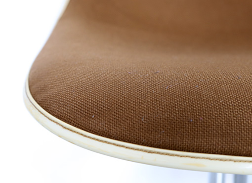 Die hier angebotenen Fiberglasschalen und Lafonda-Füsse wurden in den 1970er Jahren von Vitra hergestellt und mit den zeittypischen dunkelbraunen Vollpolstern versehen, die einen hohen Sitzkomfort garantieren. Die Polster sind gereinigt und in praktisch einwandfreiem Zustand. Leichte Vergilbung an der Hartplastikumrandung. CHF 650.–/Paar