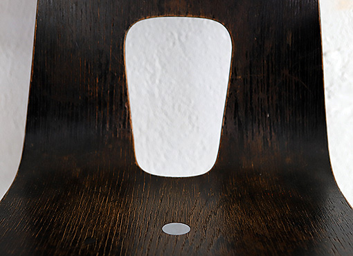 Mit dem Einpunktstuhl gelingt dem am Bauhaus ausgebildeten Hans Bellmann eine Ikone des Schweizer Nachkriegdesigns und einer der innovativsten Stühle seiner Zeit. Die als freie Form ausgesägte Öffnung im Übergang von Rücken- und Sitzfläche dient einerseits als Griffloch und führt andererseits zu einer leicht elastischen Rückenlehne. Neben diesem einfachen aber wirkungsvollen Eingriff besteht die eigentliche Leistung Bellmanns in der Verbindung der Holzschale mit dem Metalluntergestell: Die Schale liegt auf vier Metallhöckern, gegen die sie mit Hilfe einer einzigen Schraube in der Sitzmitte gedrückt wird. Hergestellt wurde der 1951/52 entworfene Stuhl von Horgen-Glarus. Die hier angebotenen Stühle in schwarz lackierter Eiche wurden in den 1950er Jahren bei Wohnbedarf Basel gekauft. Siebzig Jahre des Gebrauchs sind nicht spurlos an den Stühlen vorbeigegangen, so dass der Lack an manchen Stellen licht geworden und der eine oder andere Kratzer geblieben ist. Schön gealtert sind sie allemal. CHF 1200.–/Set