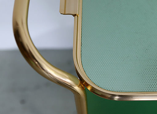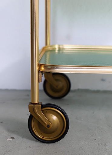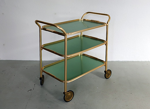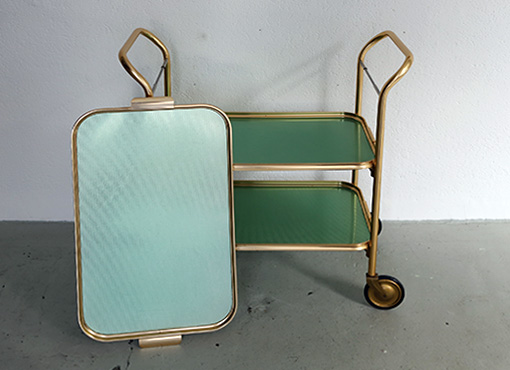 Ursprünglich als Hersteller von Radiogehäusen tätig, spezialisierte sich die in London ansässige Firma nach dem Zweiten Weltkrieg auf die Herstellung von anodisierten Aluminiumproduktion und der Markenname Kaymet wurde eingetragen. Als eigentliches Kerngeschäft erwiesen sich sich zahlreiche Tablets aus bunt eloxiertem Aluminium, deren Oberfläche mit einem Punktmuster versehen wurden, um sie gegen Kratzer beständiger zu machen. Bei dem hier angebotenen, golden eloxierten Servierboy verfügt die obere Ablage über Griffe und kann als Serviertablett verwendet werden. Länge 71cm, Breite: 37cm, Höhe (oberstes Serviertablett) 63cm. CHF 250.–