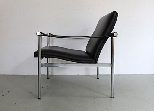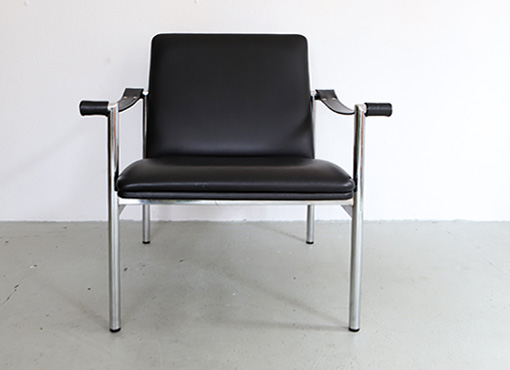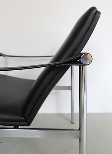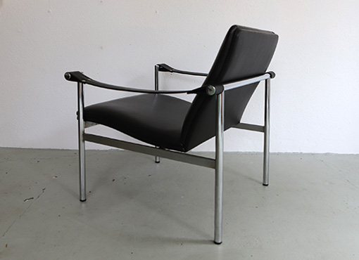 Auch der hier angebotene Sessel reiht sich hier ein, wobei die kippbare Rückenlehne hier einer flexiblen Rückenlehne weichen musste, denn der lose aufliegende Sitz kann in verschiedenen Positionen eingerastet werden. Wer hinter dem Sessel mit verchromten Untergestell und Kunstledersitz steht, bleibt ein Geheimnis. Seiner Komfortabilität tut dies freilich keinen Abbruch. CHF 300.–