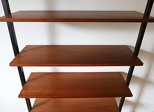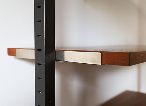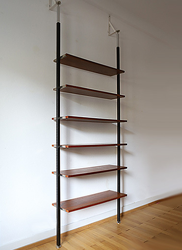 Ende der fünfziger Jahre begann sich das Warenhaus Globus stärker mit modernen Möblierungsfragen auseinanderzusetzen und lancierte unter anderem Wettbewerbe zur Förderung neuer Ideen. Neben dem Verkauf bekannter Marken entwickelte Globus um 1960 auch ein Eigensortiment mit qualitativ hochwertigen Möbeln, von denen ein grosser Teil von Frank Bolliger entworfen wurden. So wohl auch dieses Spannstützenregal, mit Tablaren mit Teakholzfurnier. Schwarz lackierte Stahlstangen mit verstellbarem Aluminiumprofil erlauben Höhen zwischen ca. 240 bis 270cm. Breite 94cm. CHF 400.– (RESERVIERT)