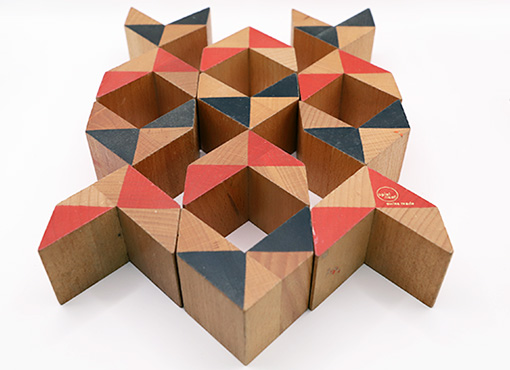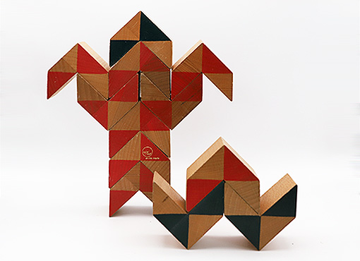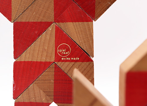Obschon das Angolo-Spiel heute recht selten zu finden ist, stammt es von einem international bekannten Spielzeugdesigner: Der Engländer Patrick Rylands feierte etwa mit dem Spiel Play Plax einen Grosserfolg. Auch das Angolo zeichnet sich durch seine an sich einfache Form aus, die aber ungeahnte Kombinationsmöglichkeiten zulässt. Bei der hier angebotenen frühen Ausführung, lassen die lasierten Dreiecksflächen gegenüber den bei anderen Versionen vollständig lackierten Steinen weitere Effekte zu. Übrigens schöpfte Naef das Verkaufs-Potential des prominenten Designers nicht ganz optimal aus: Auf den Originalverpackungen wurde der Designer mit „Rjland“ angegeben. Die kleinen Baumeister:innen dürfte das allerdings kaum gestört haben. 12 Klötze aus massivem Buchenholz, beidseitig lasiert (eine Seite schwarz, die andere rot), ohne Verpackung. CHF 150.–